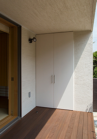 開口部内側には、壁に引き込む木製の内雨戸を設けている。
