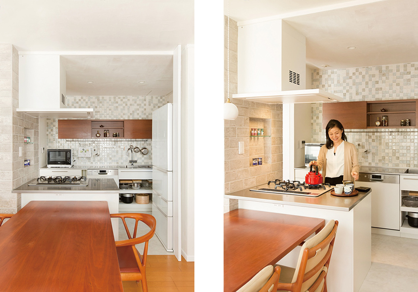 以前は孤立していたキッチンがオープンになり、明るい空間に。 一人でも、家族一緒にでも料理がしやすくなった。